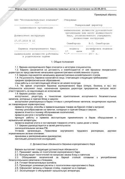 Должностная инструкция бармена. жалоб и т.д.) дают общее представление о форме и примерном содержании документа определенного вида.